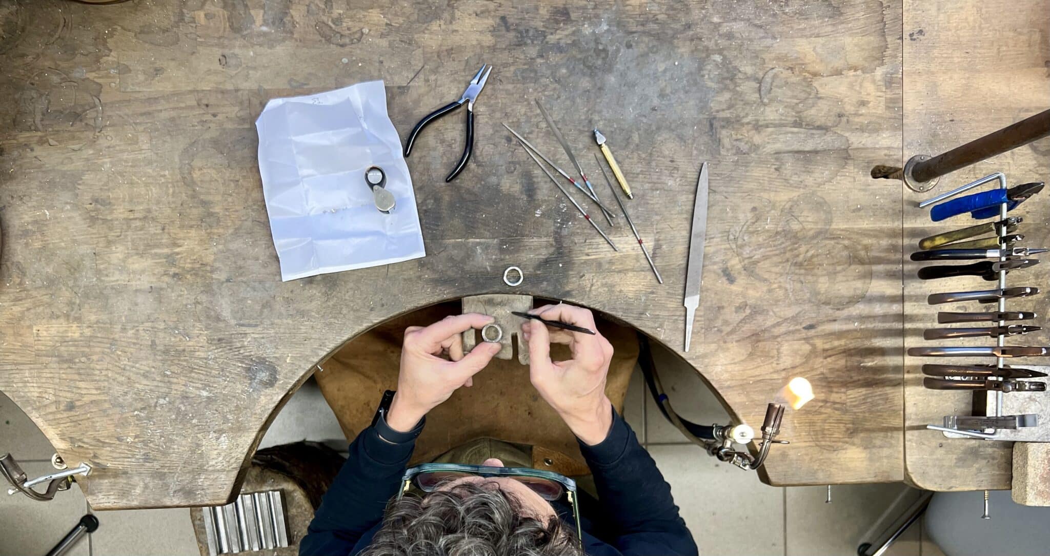 Dans l’atelier situé au sein de la boutique, et visible de la rue, Claire, Gilles et Maelle, les joailliers créent, fabriquent, transforment et réparent vos bijoux en or , en argent ou en platine.
