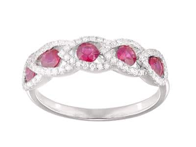 Une bague feuilles en or blanc 18 carats , sertie de 5 rubis ronds (0.63ct) et de diamants taille brillant(0.22ct qualité HSI)