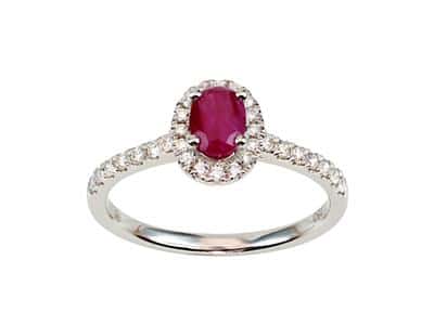 Elle se compose d’un Rubis ovale de 0,52ct, entouré de diamants et un corps de bague serti de diamants taille brillant (0.28ct HSI)